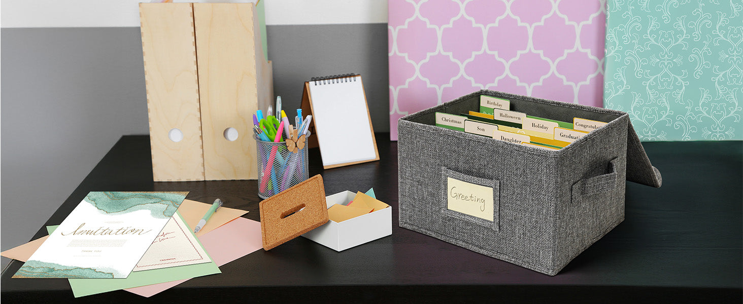 Keeps greeting cards neatly organized and protected from damage.